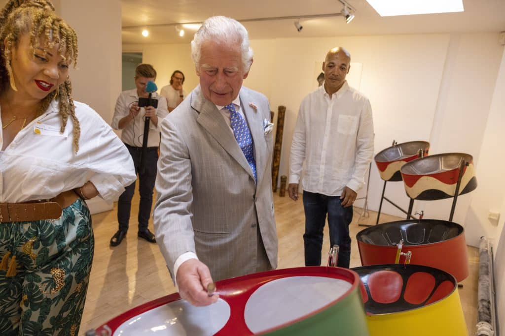 Van Charles en Camilla dit keer. De kroonprins maakt er een gewoonte van om bij dit soort bezoeken zijn skills te showen. Vorige week tapte hij een biertje. In Notting Hill bespeelde hij de steel drums. En let op: met één hand!