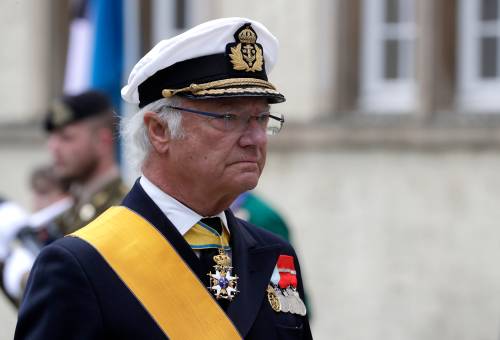 De koning draagt een admiraalsuniform met de hoogste ordetekens van alle Zweedse ridderorden en het onderscheidingsteken van Grote Commander van de Orde van Dannebrog, een waardigheid die alleen wordt toegekend aan de naaste voorvaderen van de Deense vorst.