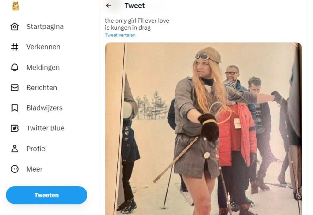 We zien een 22-jarige Carl Gustaf in dragm net make up in Alles! Nota bene ook nog op de ski’s, met blote benen. Een Twitteraar plaatste de foto, die in Zweden heel wat stof deed opwaaien.